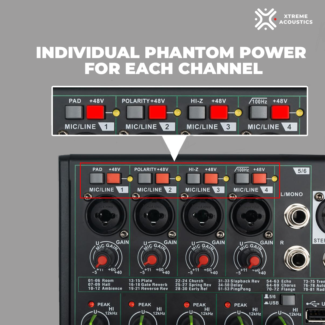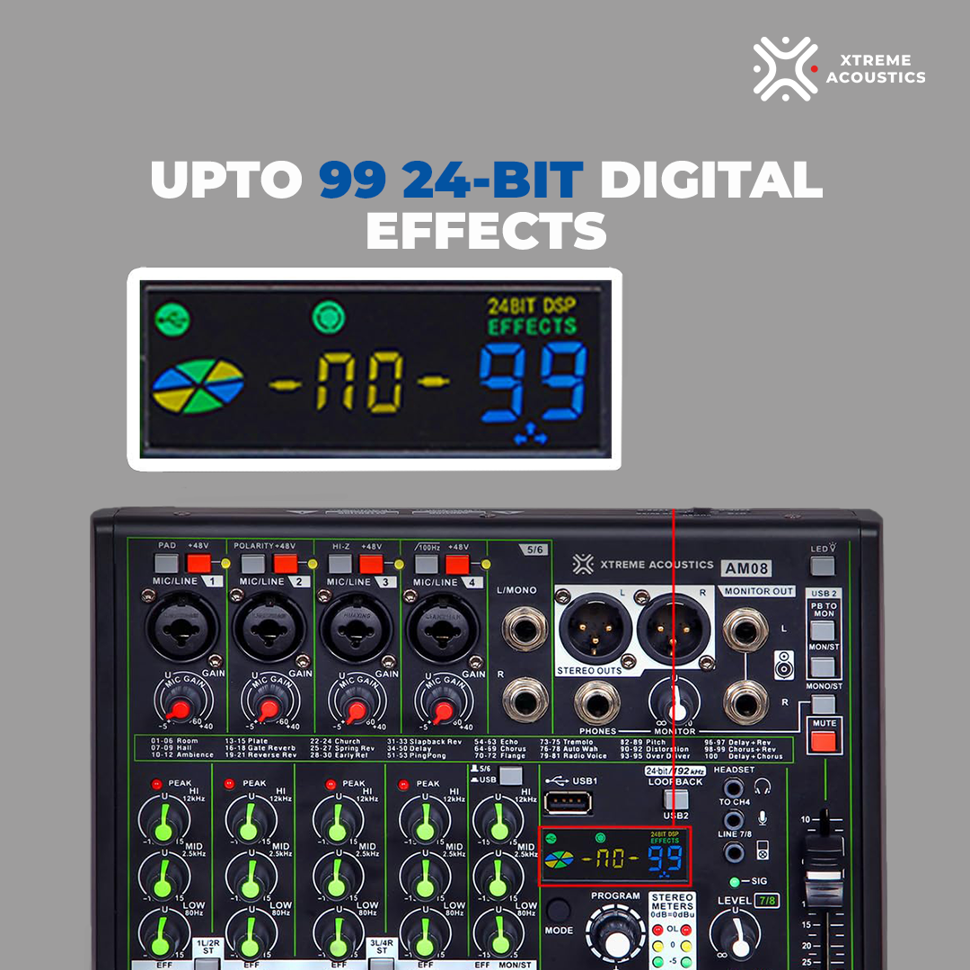 Experience studio-grade audio processing with a high sampling rate of 192KHz/24-bit, capturing every nuance of your sound with precision. The XAAM08 is equipped with 100 digital DSP effects, adding a professional touch to your creations.